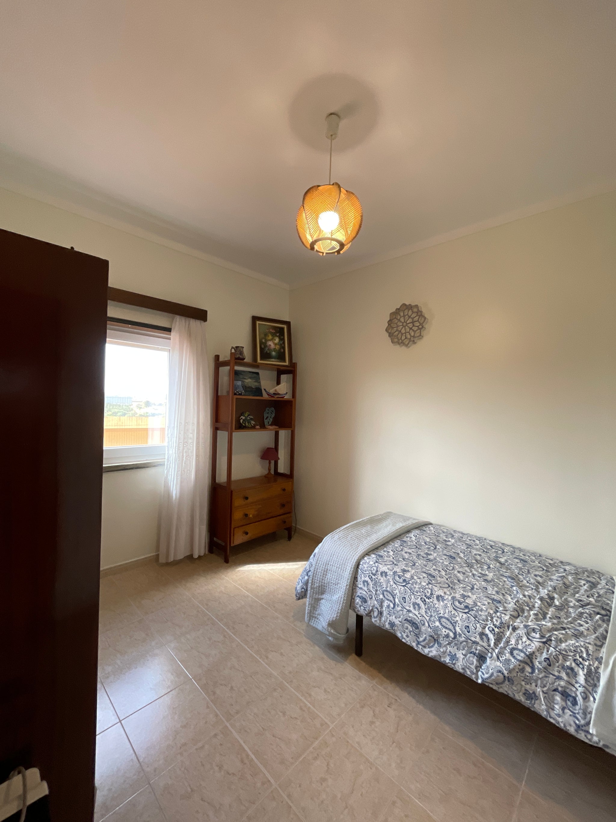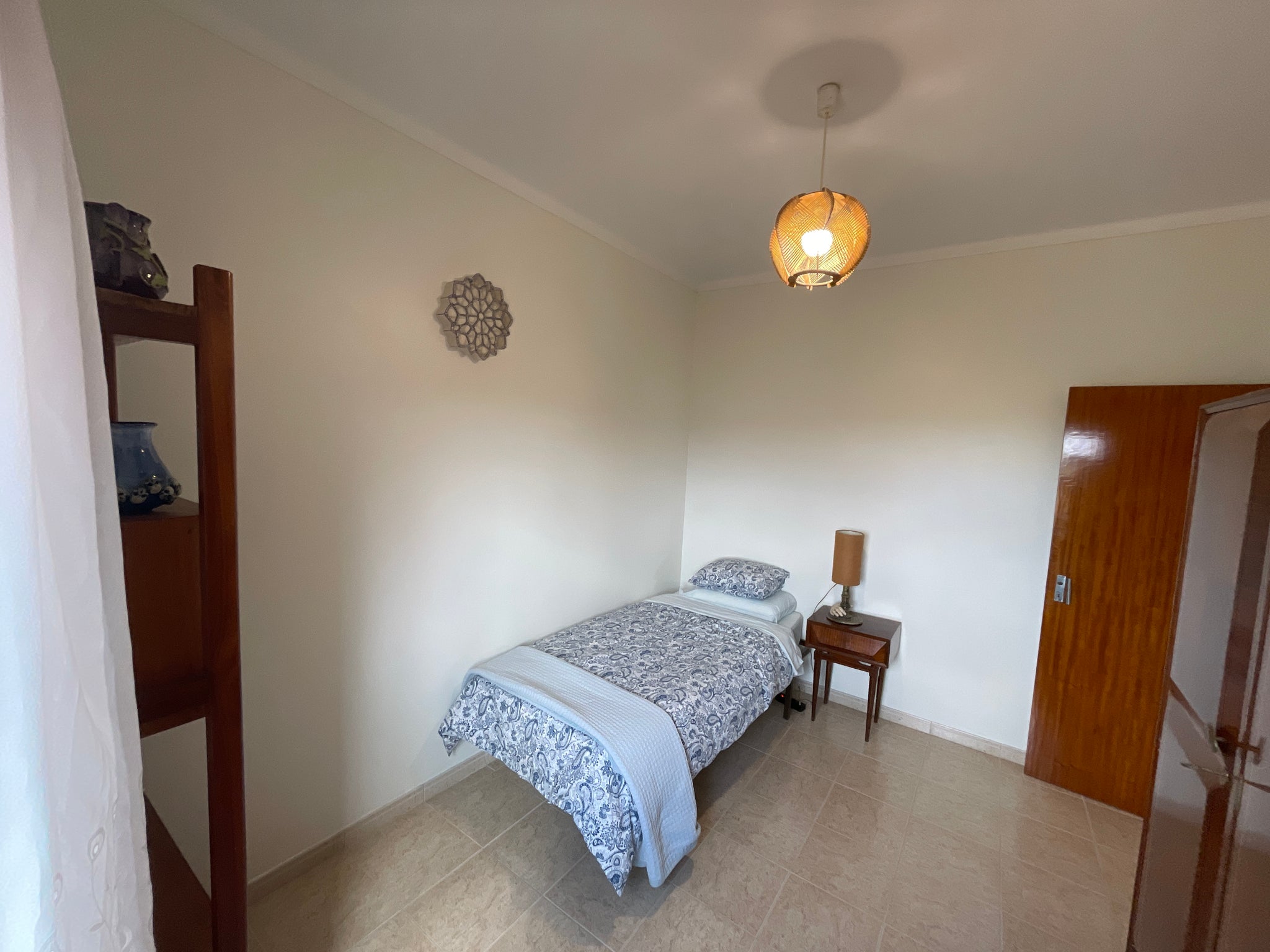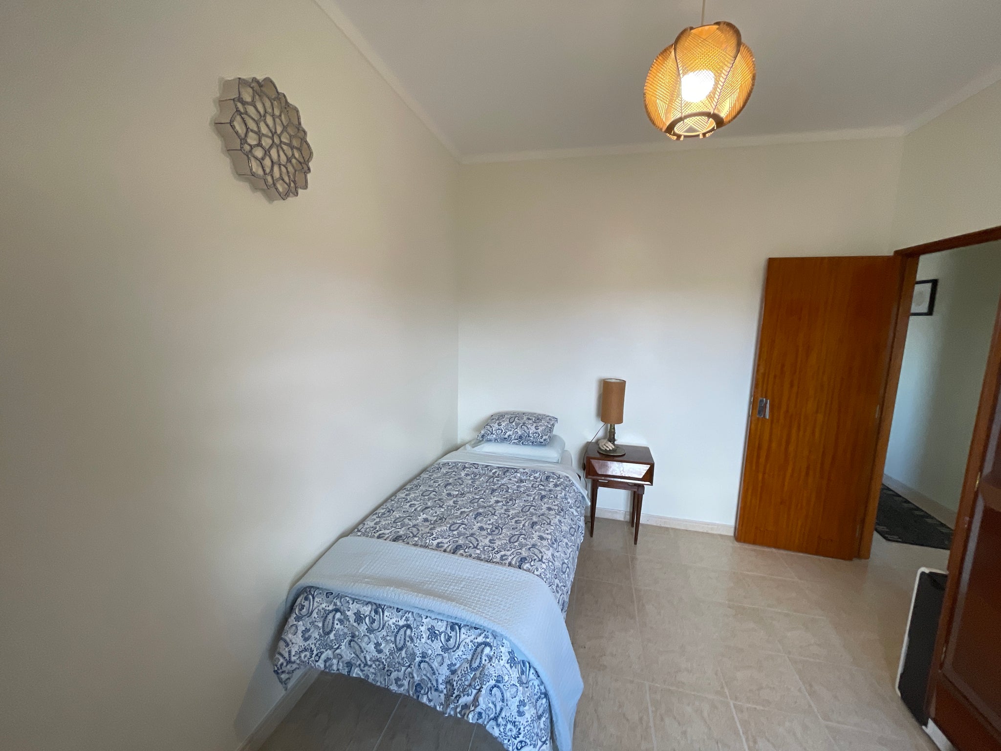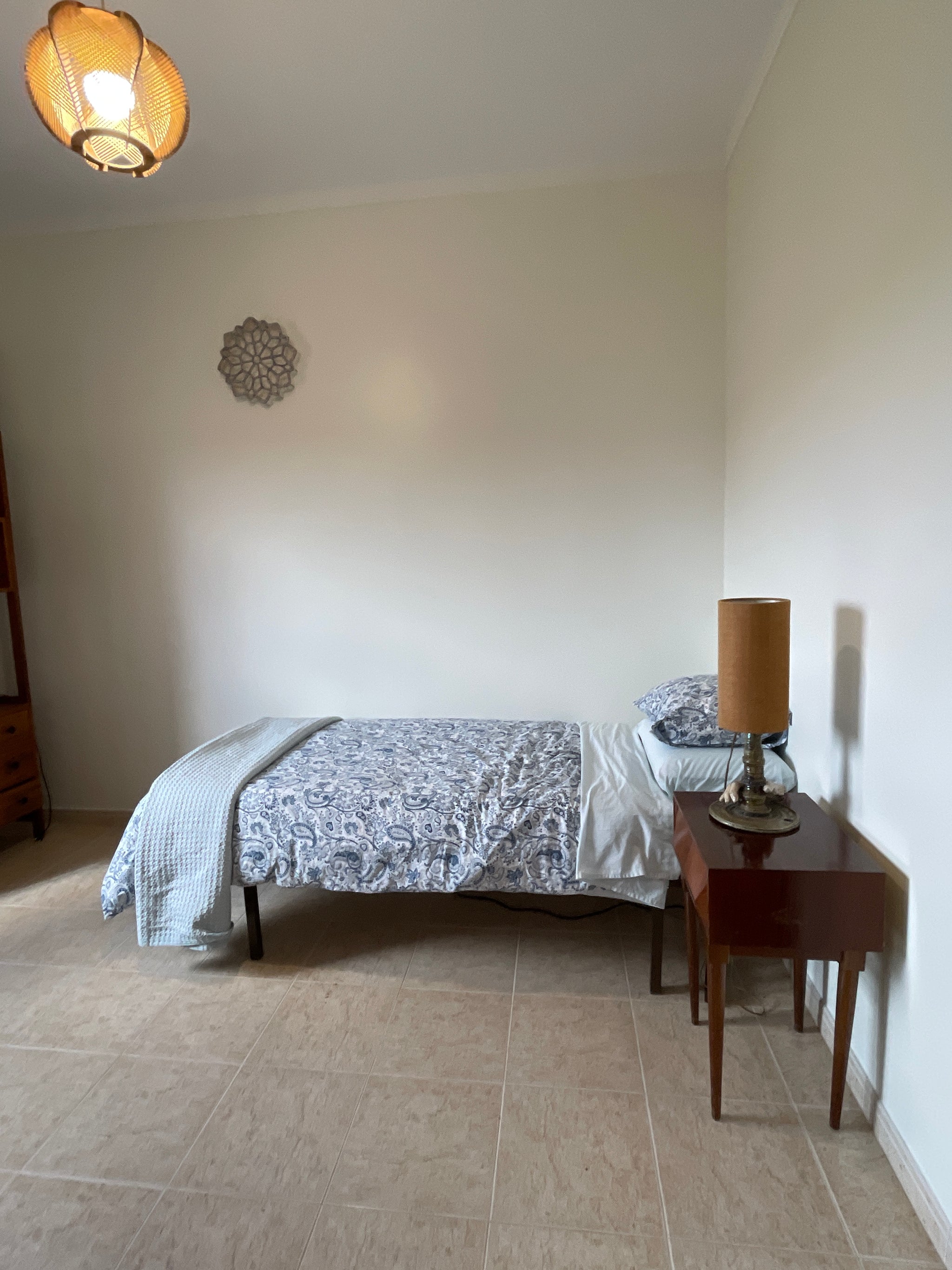A medium sized room with a twin bed. We call it the blue room because of the bedding and art. The decor is a small nod to the traditional Portuguese azulejos (blue and white tiles).