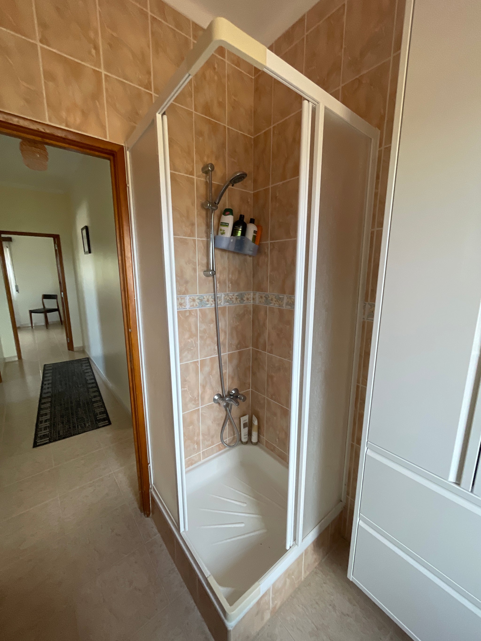 Bathroom has a standing shower, soap, shampoo, conditioner, hair dryer, towels, first aid kit. There is a second, smaller bathroom with a standing shower below the house in the studio.