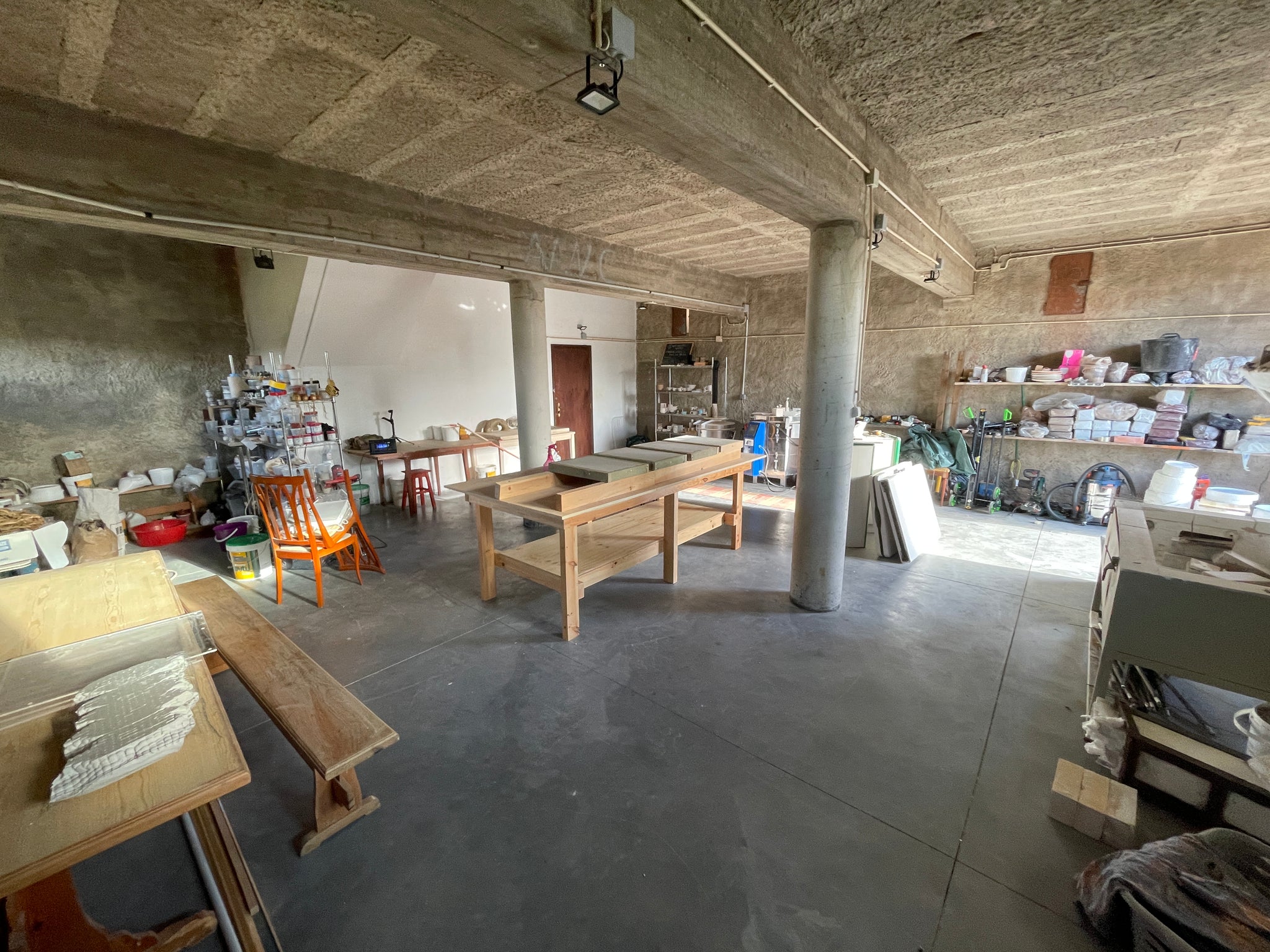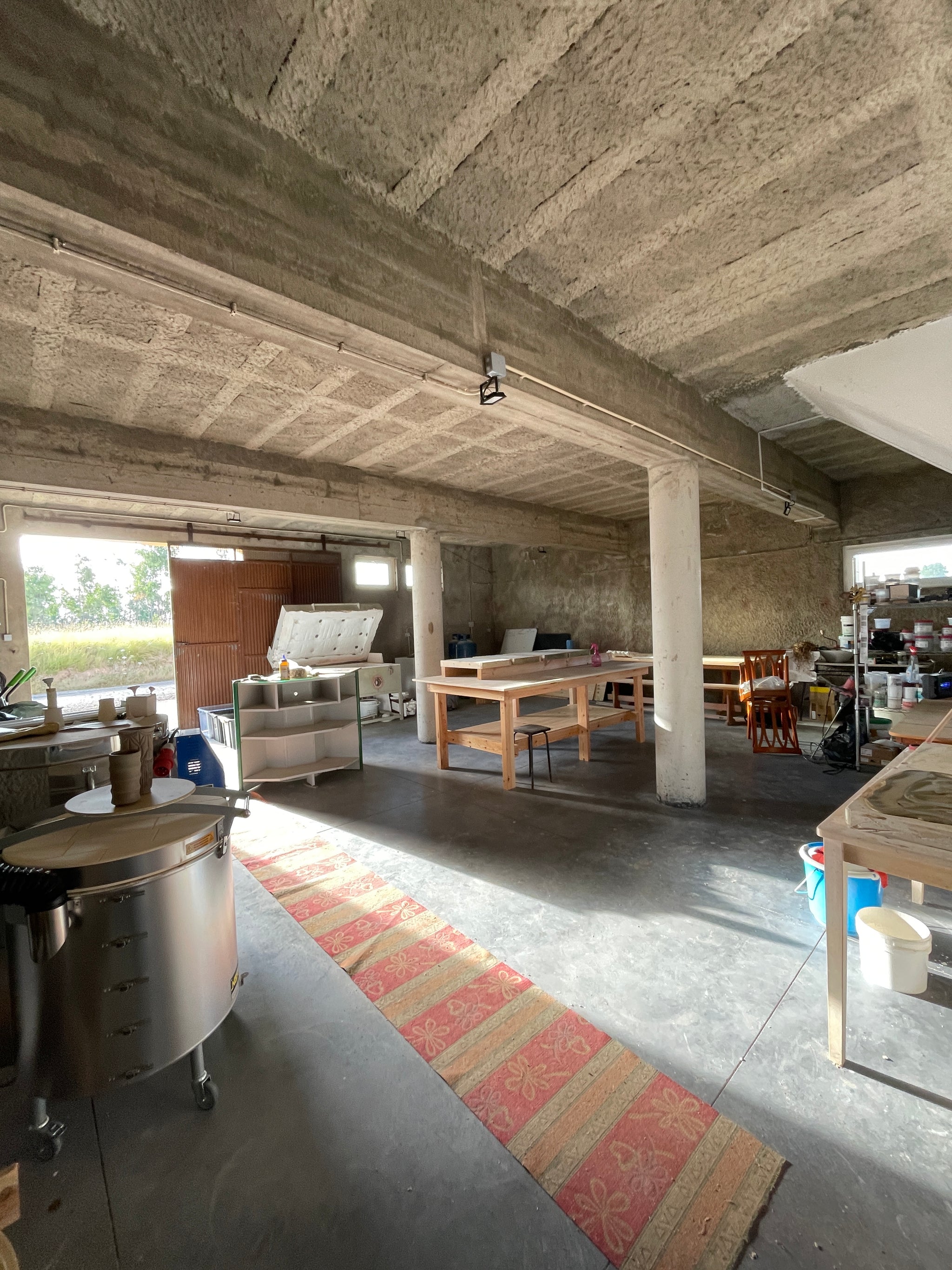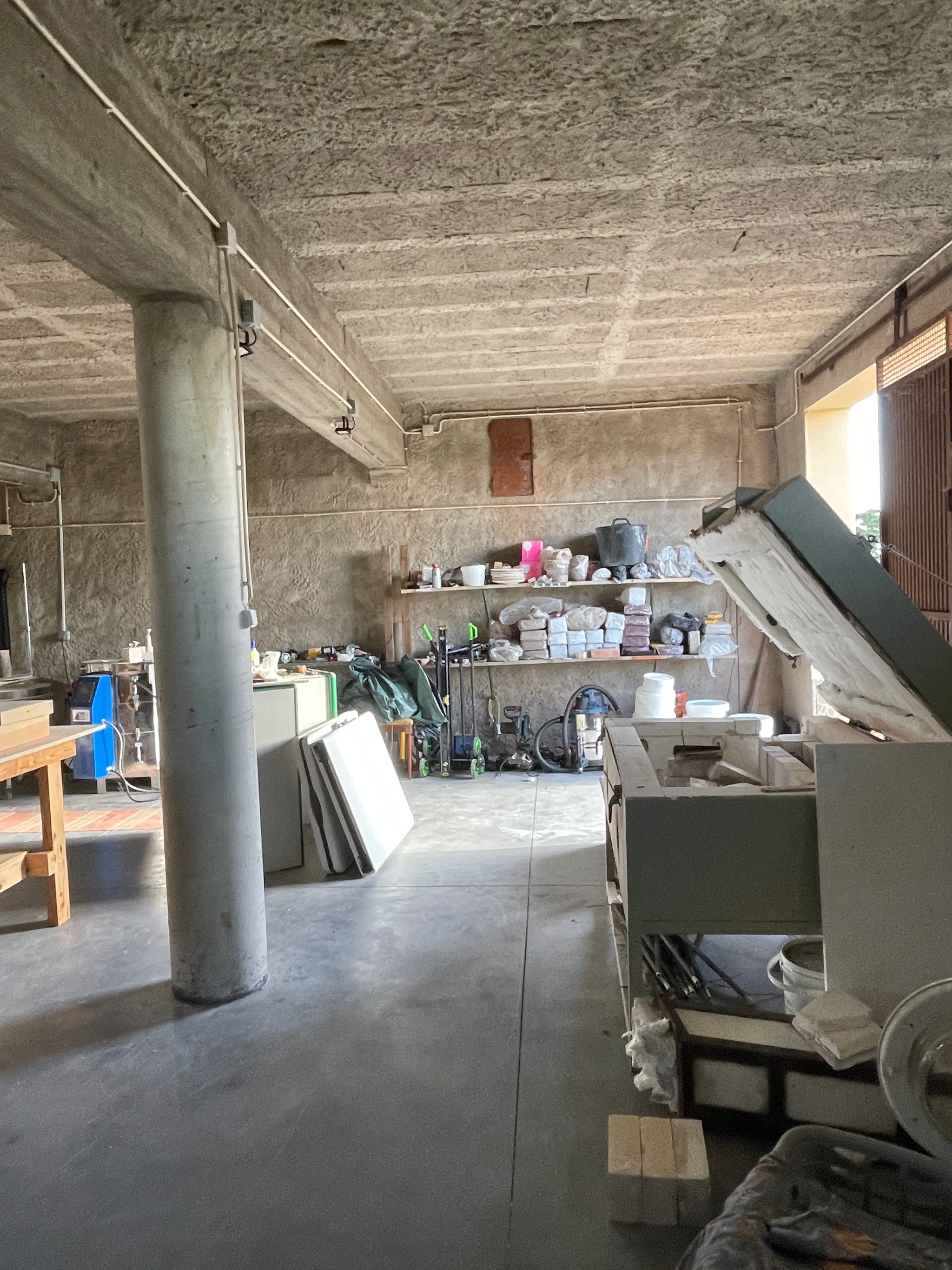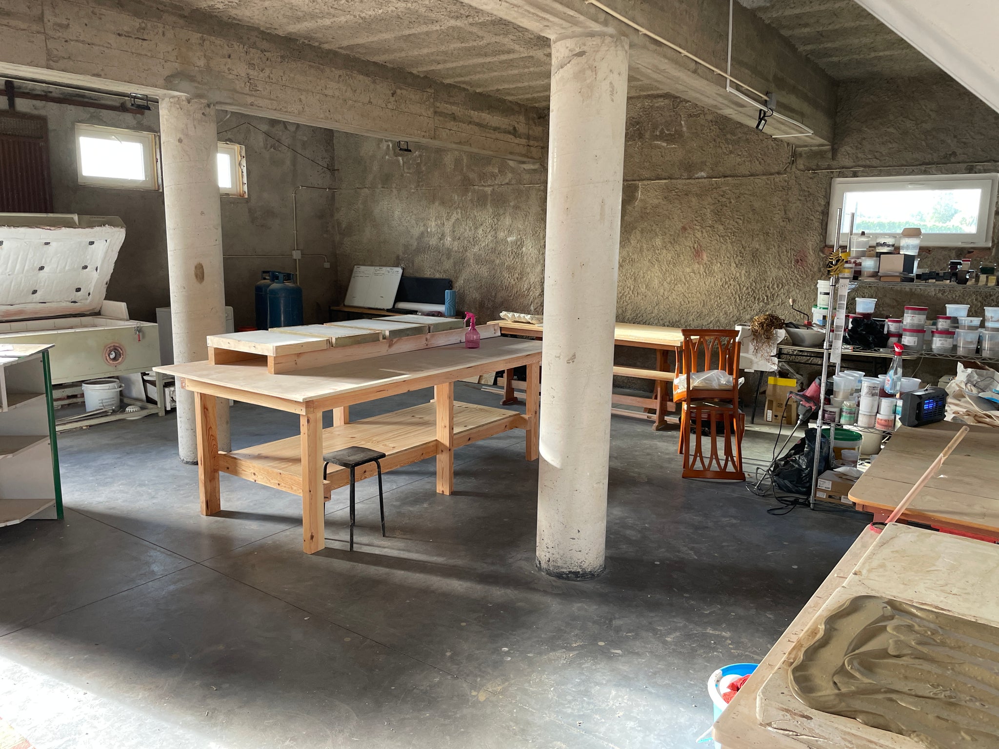 - Glaze area with minerals for mixing glazes, and a few buckets of our in house made glazes.
