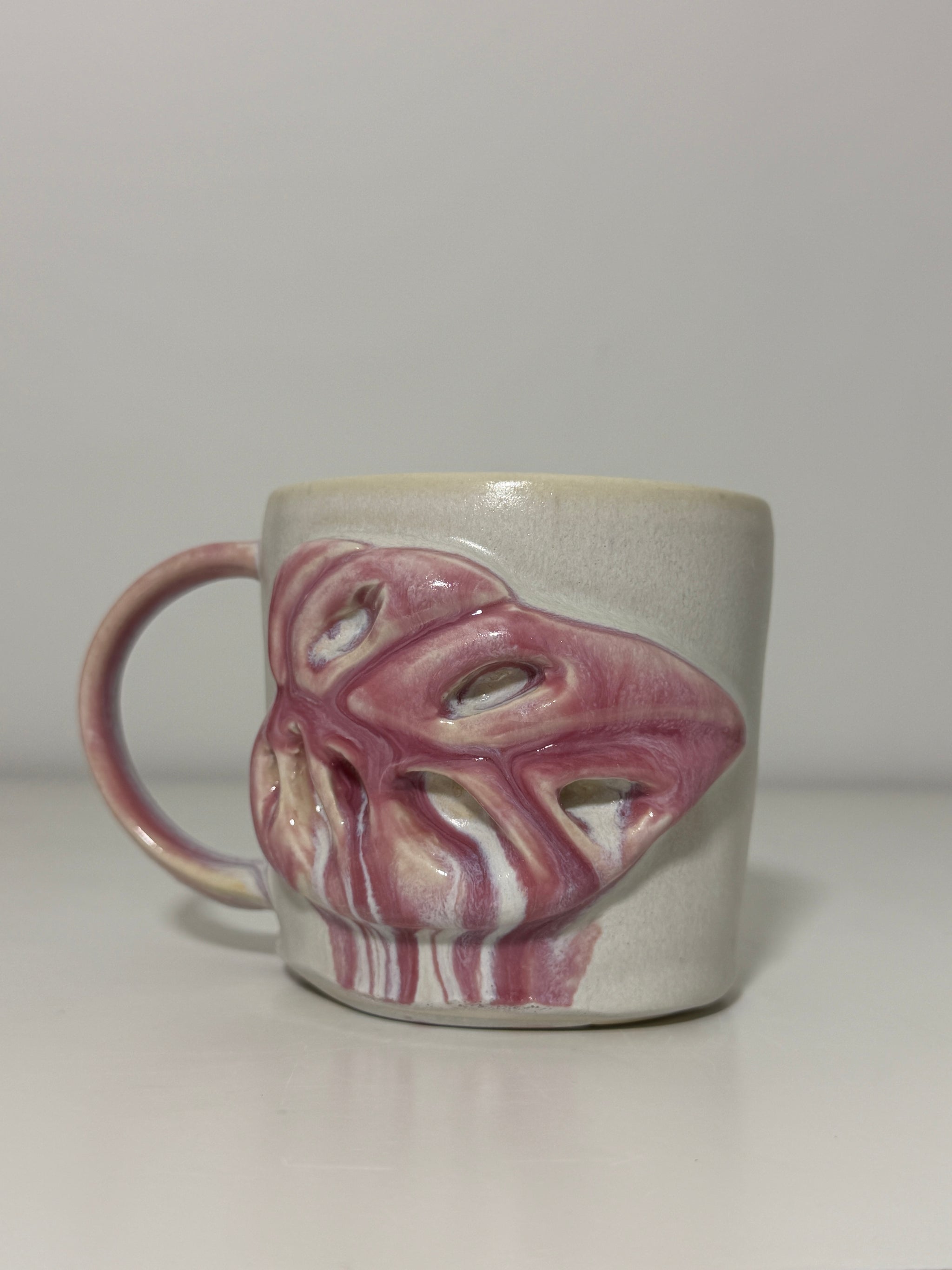 This sturdy mug was thrown on the wheel with a white clay body. It's glazed with Malibu Barbara/Unicorn Skin, creating the perfect stripy drips under the leaf. Swoon!