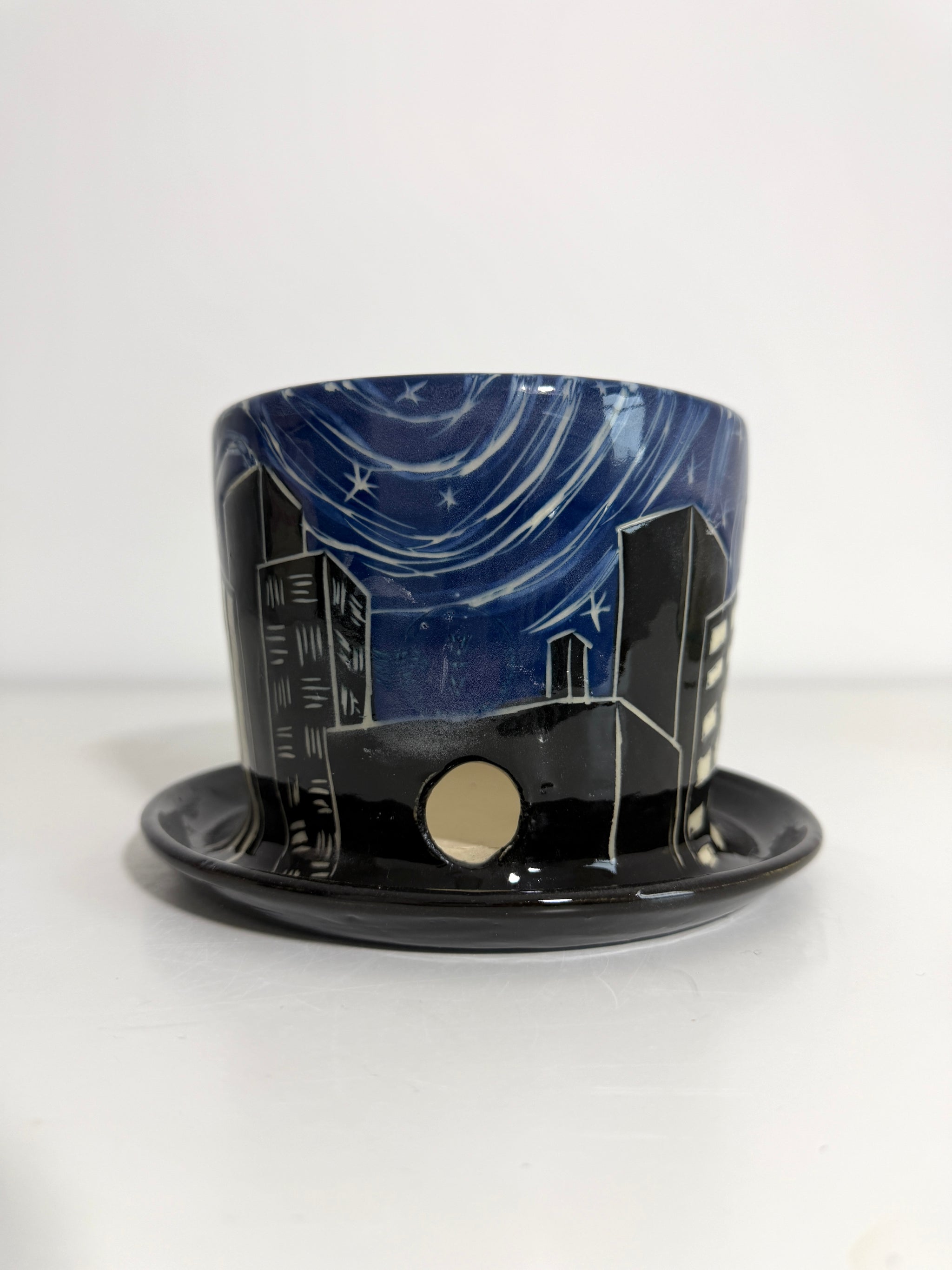 Thrown on the wheel with a stoneware clay body. I then paint 3 layers of each color of underglaze, and then carve the buildings, windows, and sky swirls before firing, and glazing.