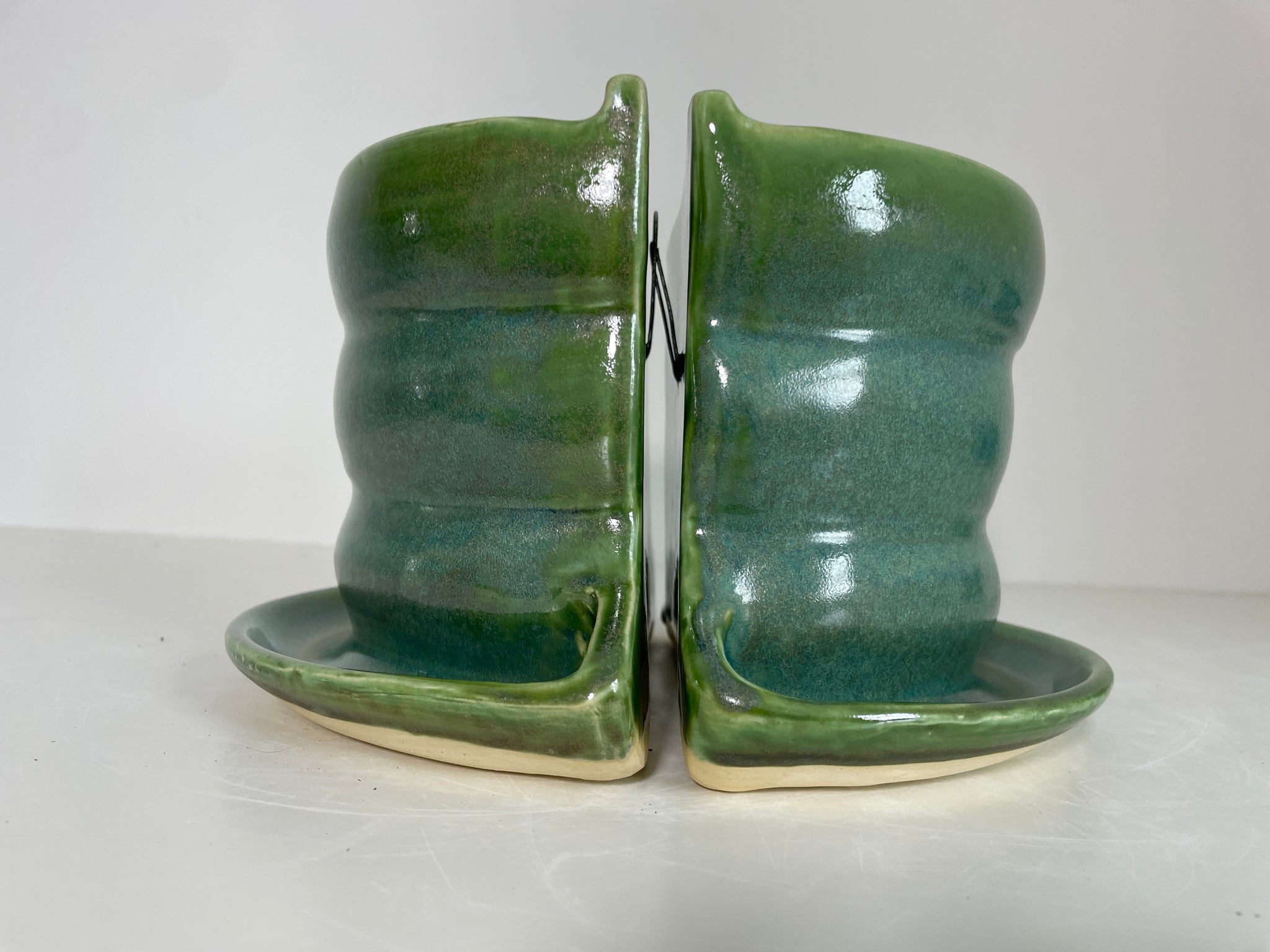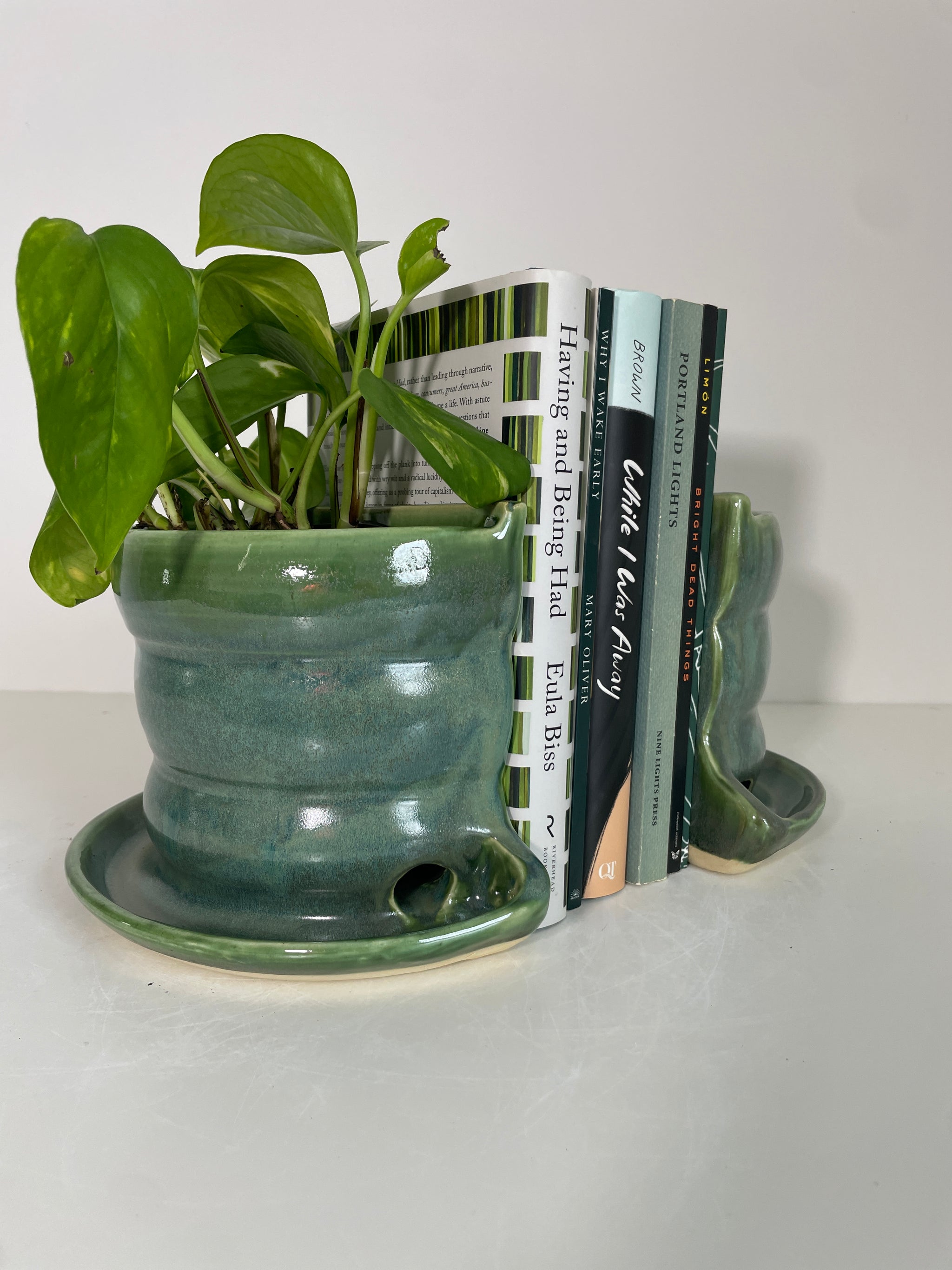Need more space for your plants? How about some truly functional planters? These are made from a 6” planter with attached saucer that’s thrown on the potter’s wheel. I then cut the planter in half, attach a slab back to each half, and voila- Bookends! This is a good place to mention that these are not perfect. Sometimes one side is a little larger, or slightly different somehow. But, hey! It’s handmade, so imperfections remind us that it’s made by a real human (me).