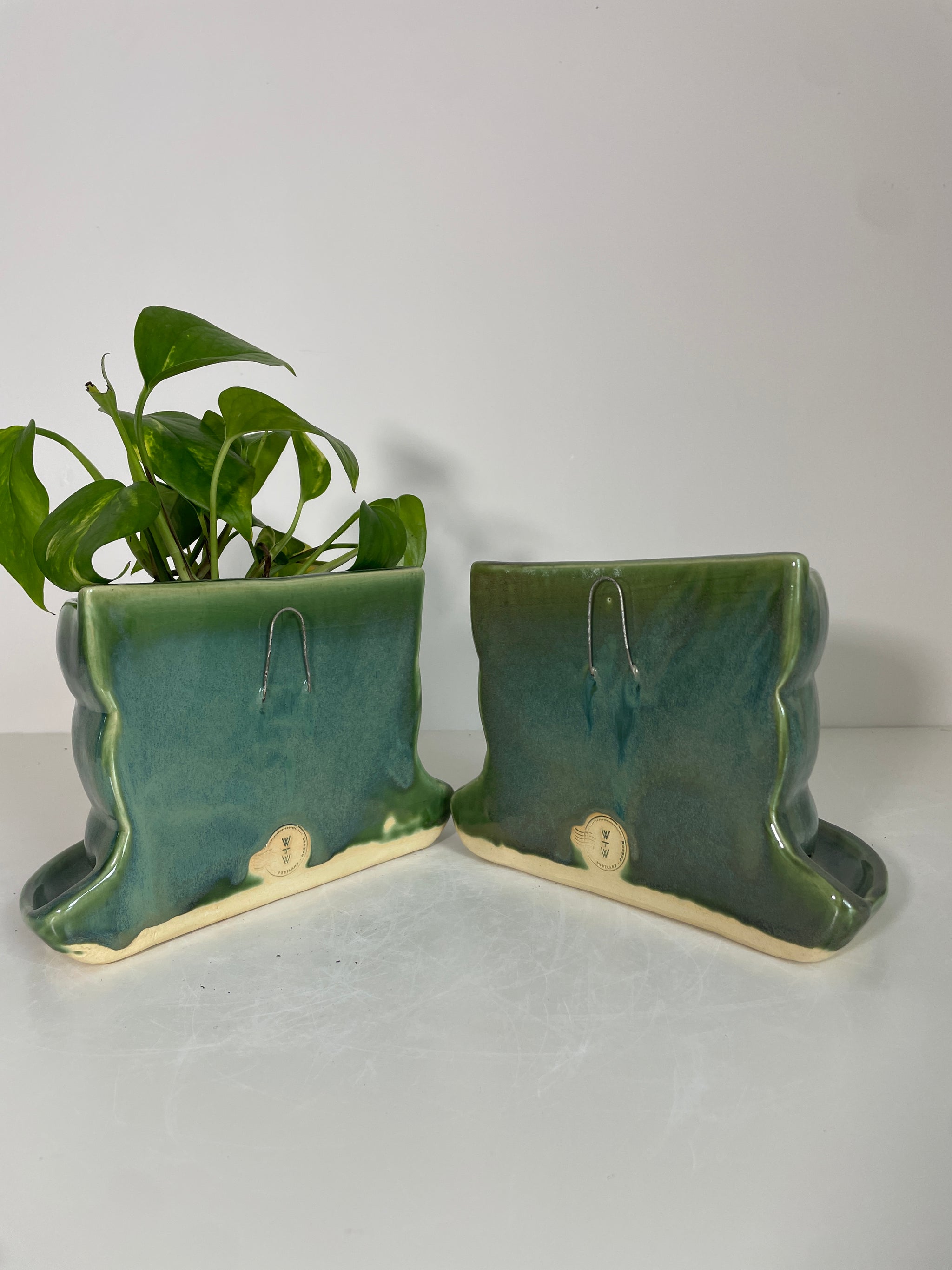 Each half has a drainage hole and once potted, is heavy enough to hold your books up for the ultimate plant shelfie. A wire hanger is built into the back to hang on the wall. Through testing and trial and error, I have made the backs of the bookends taller than the front lip of the pot. This should prevent water from spilling over the back of the pot and getting your books wet, however I recommend moving the pot for watering, just in case. The same is true for when they hang on the wall. The back wall should prevent overflow on the wall, but taking them down to water is a good safety precaution.