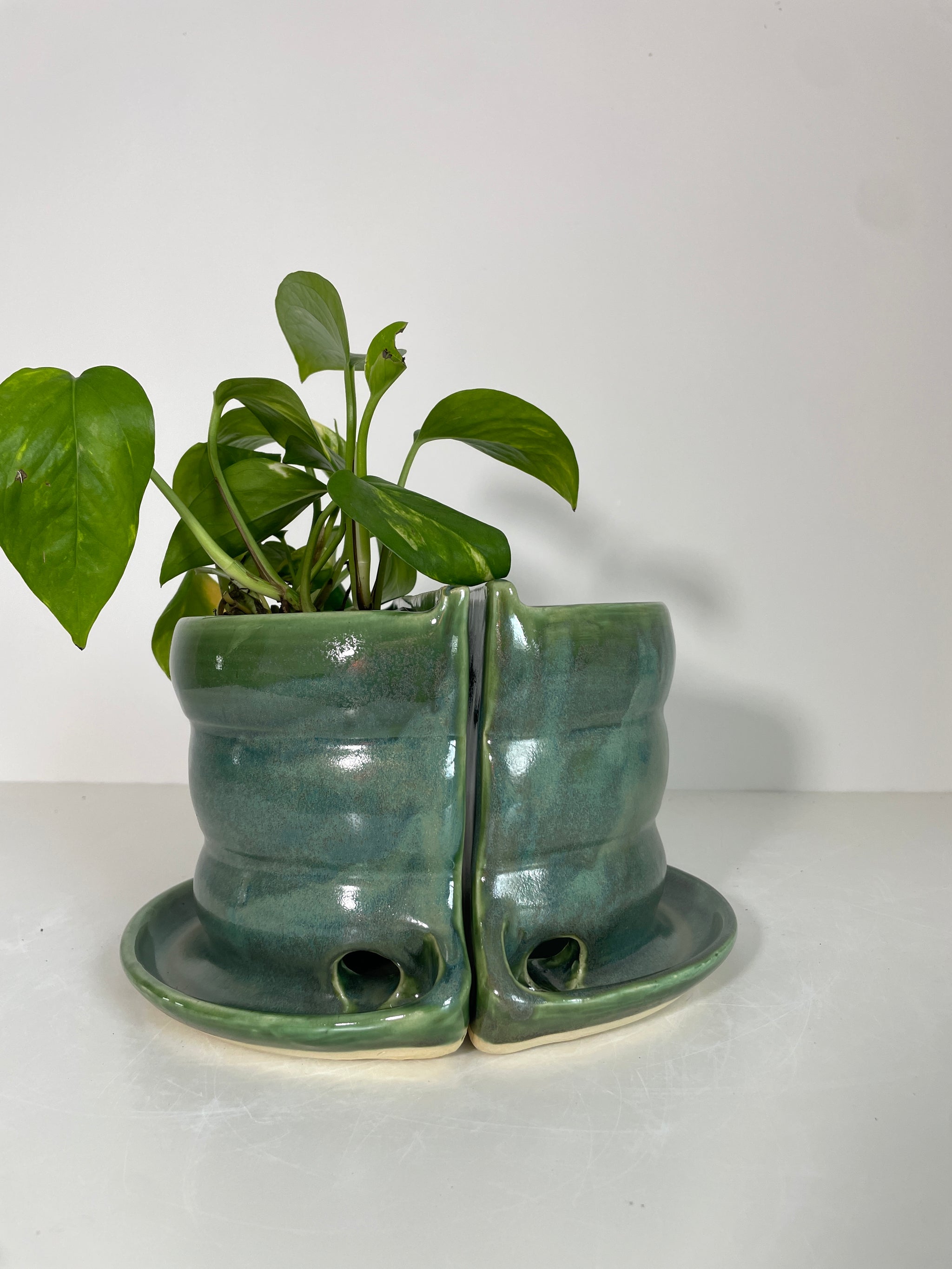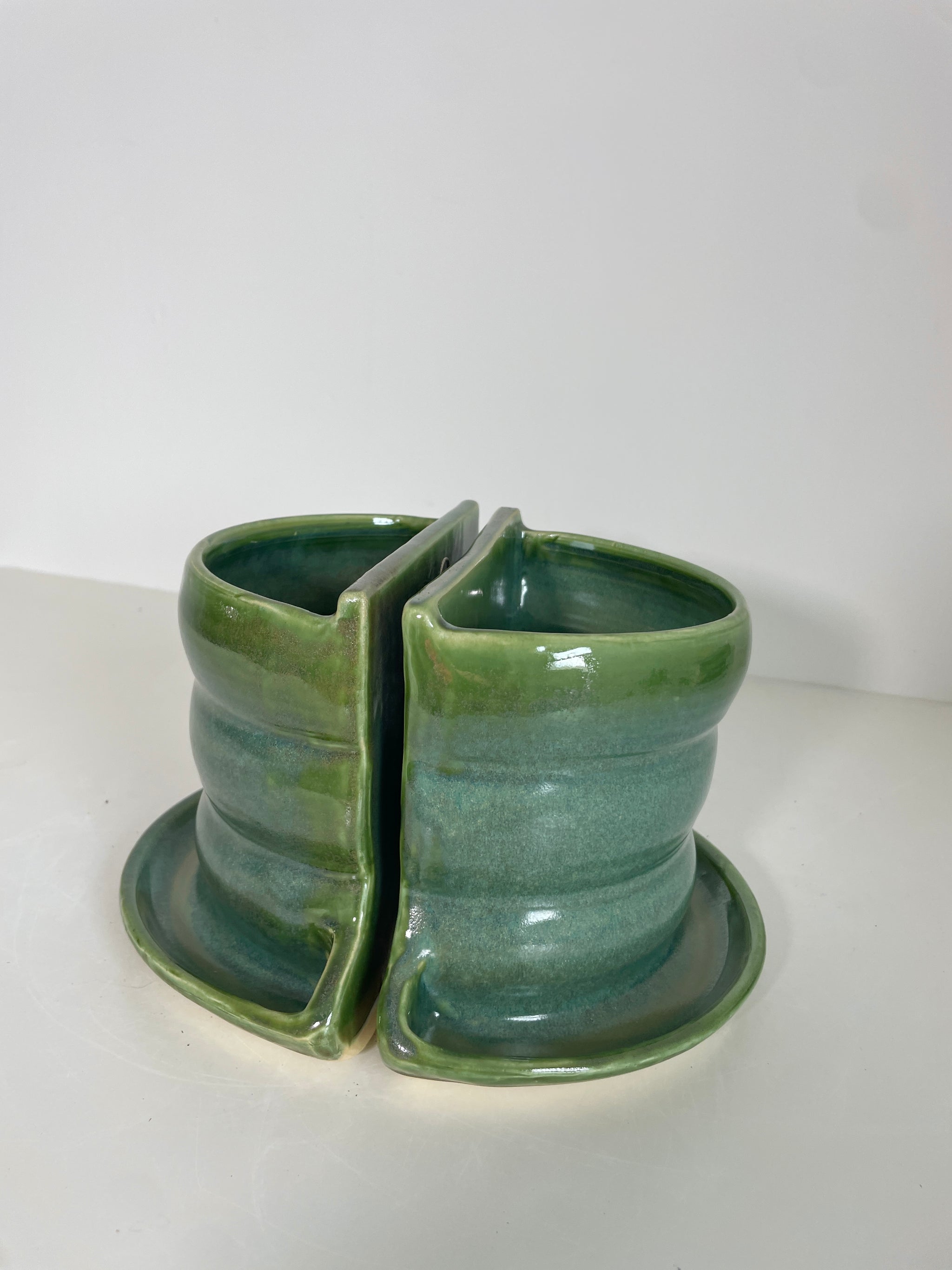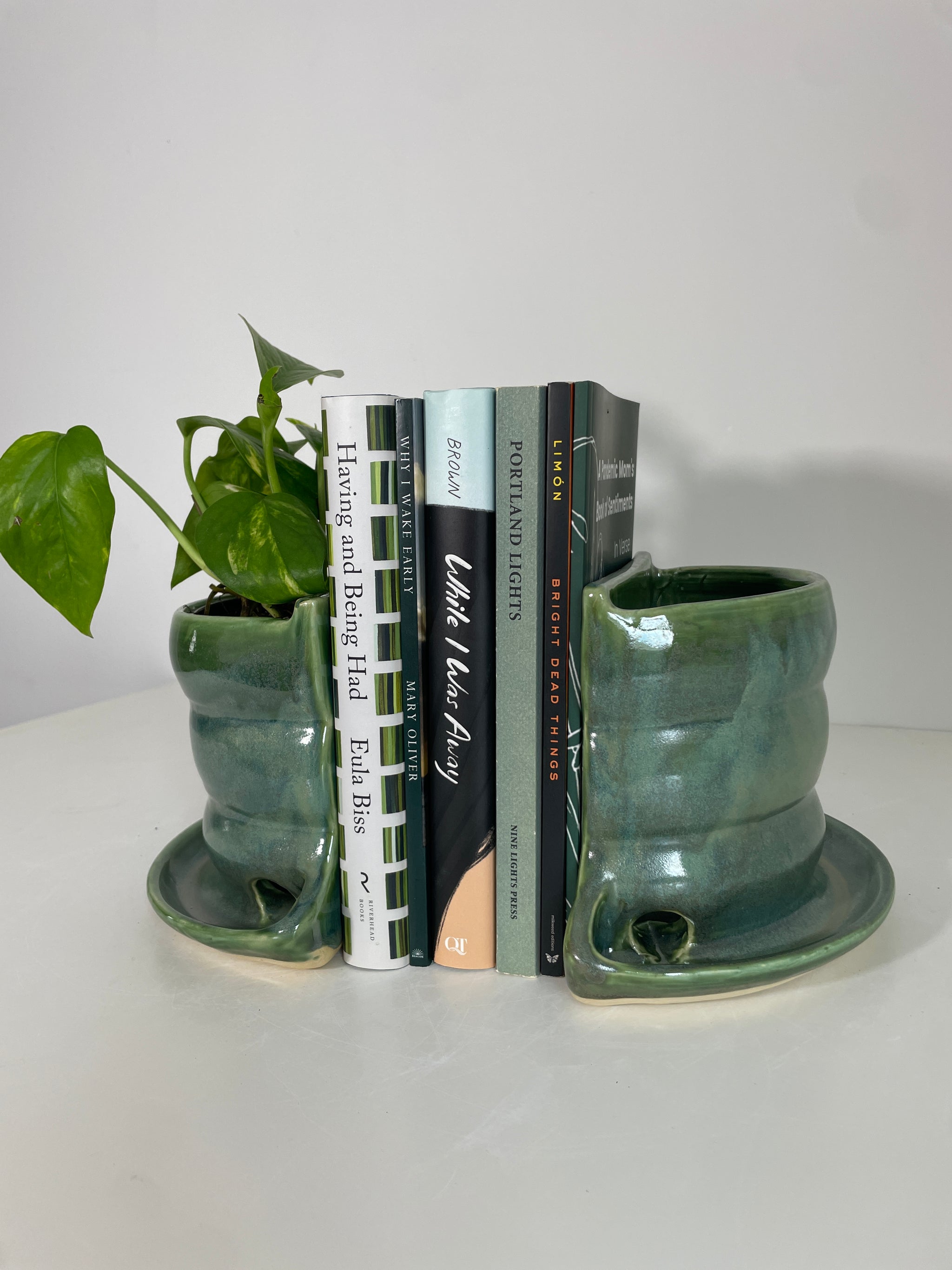Need more space for your plants? How about some truly functional planters? These are made from a 6” planter with attached saucer that’s thrown on the potter’s wheel. I then cut the planter in half, attach a slab back to each half, and voila- Bookends! This is a good place to mention that these are not perfect. Sometimes one side is a little larger, or slightly different somehow. But, hey! It’s handmade, so imperfections remind us that it’s made by a real human (me).