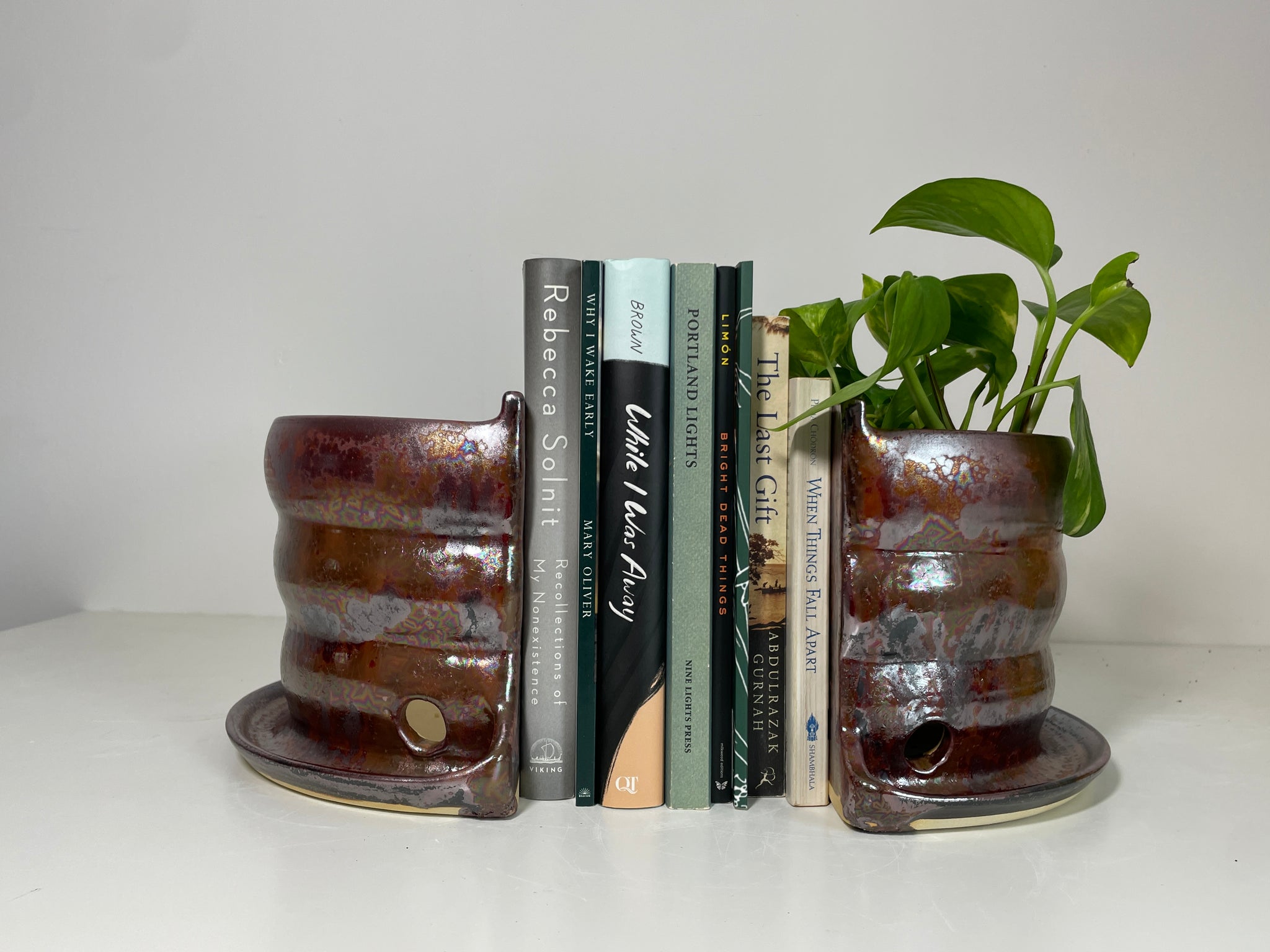 Need more space for your plants? How about some truly functional planters? These are made from a 8” planter with attached saucer that’s thrown on the potter’s wheel. I then cut the planter in half, attach a slab back to each half, and voila- Bookends! This is a good place to mention that these are not perfect. Sometimes one side is a little larger, or slightly different somehow. But, hey! It’s handmade, so imperfections remind us that it’s made by a real human (me).