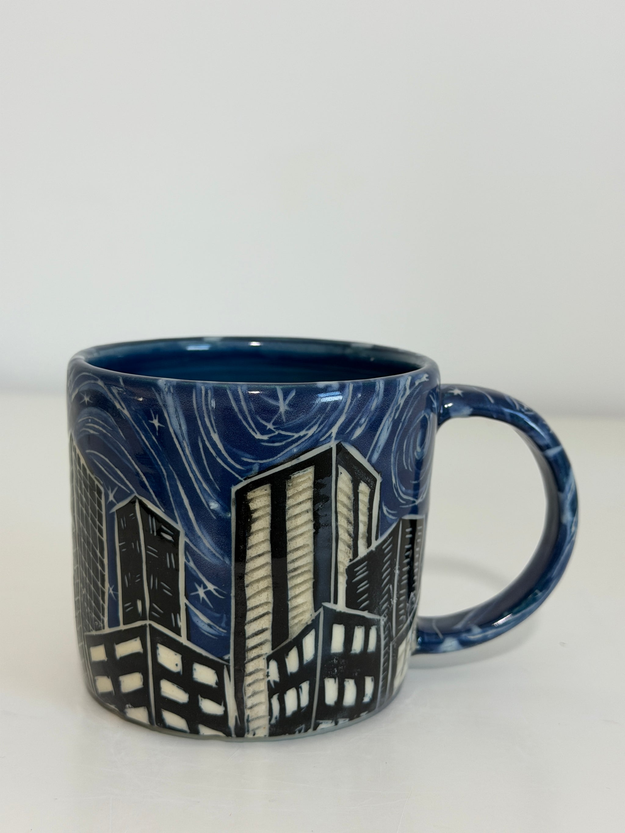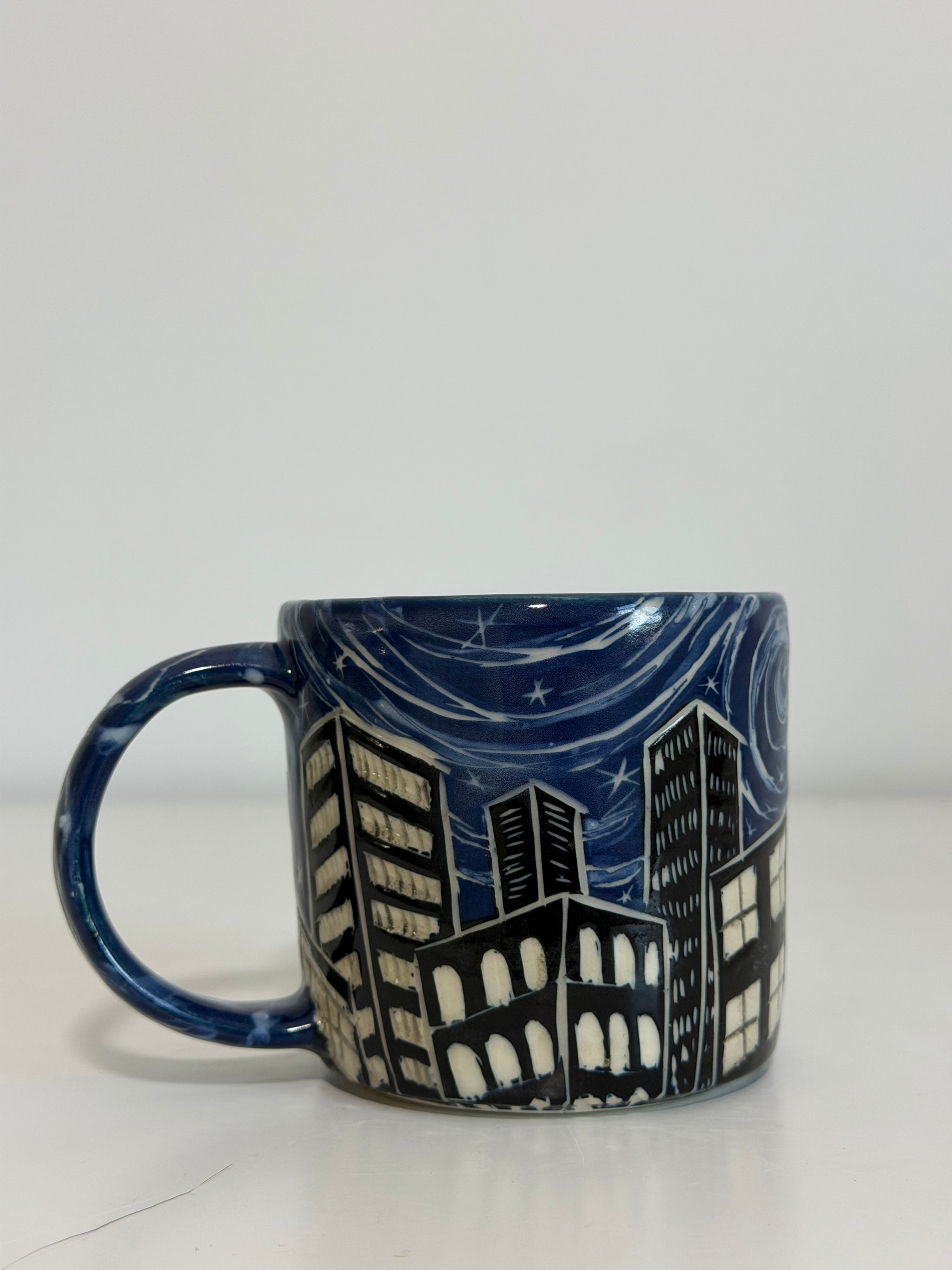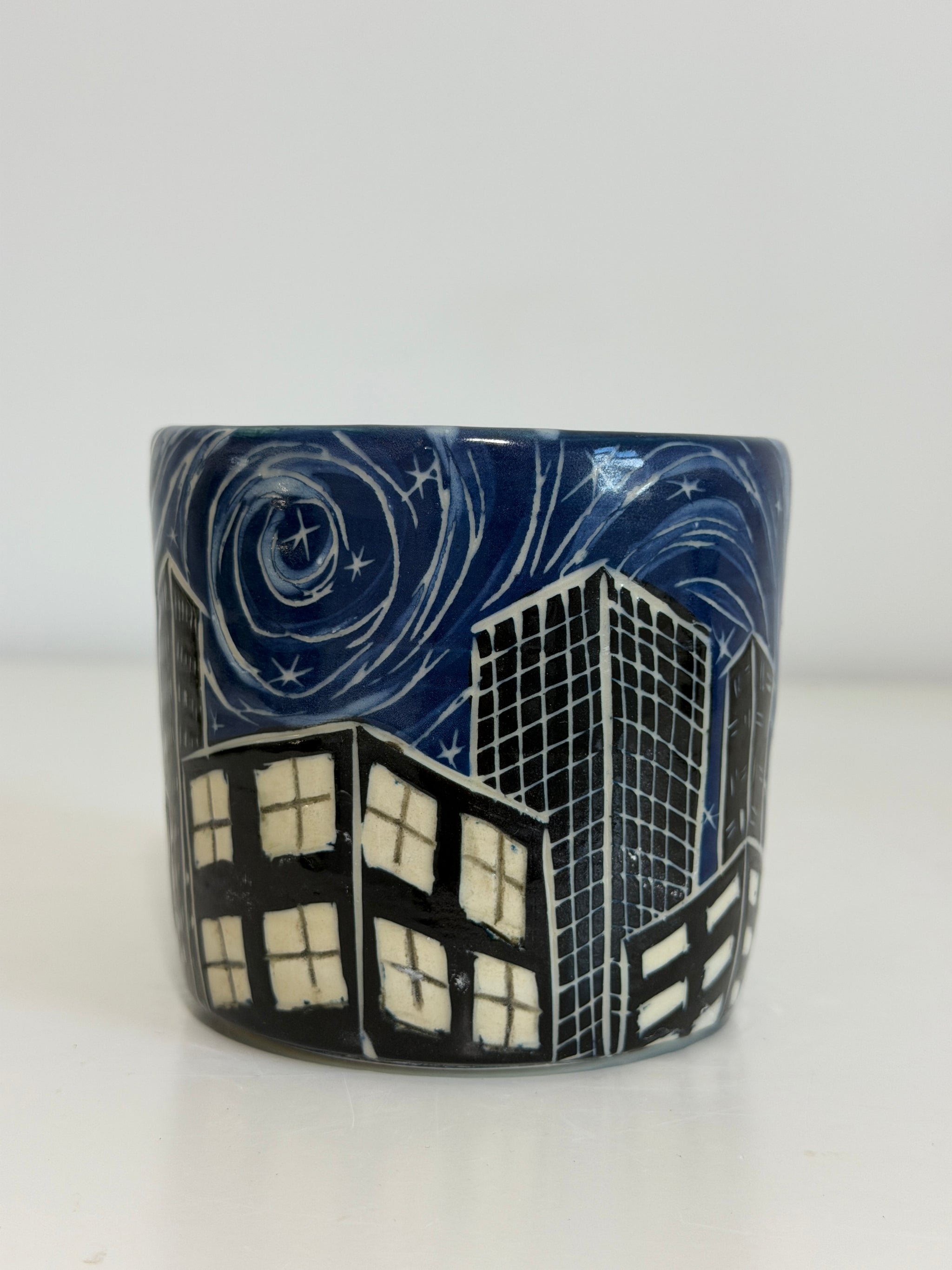Thrown on the wheel with a stoneware clay body. I then paint 3 layers of each color of underglaze, and then carve the buildings, windows, and sky swirls before firing, and glazing.