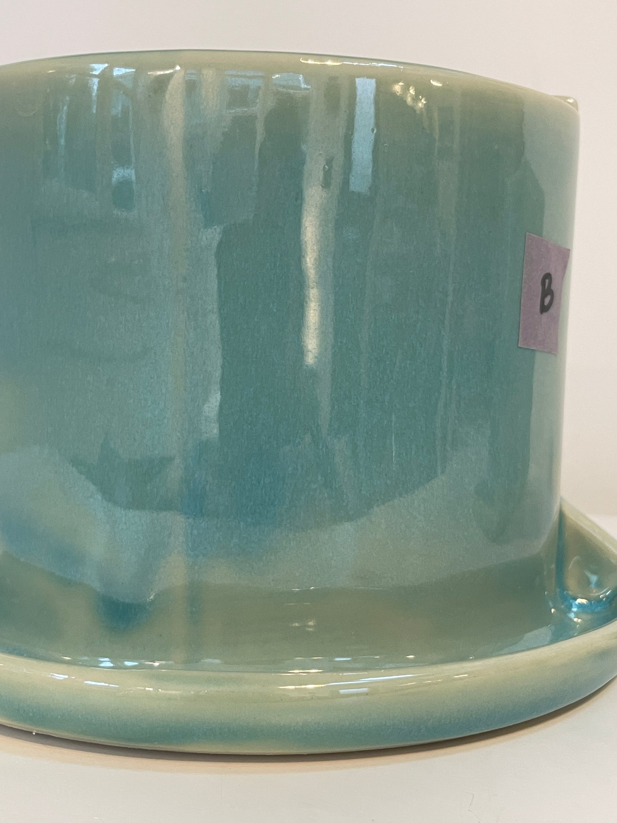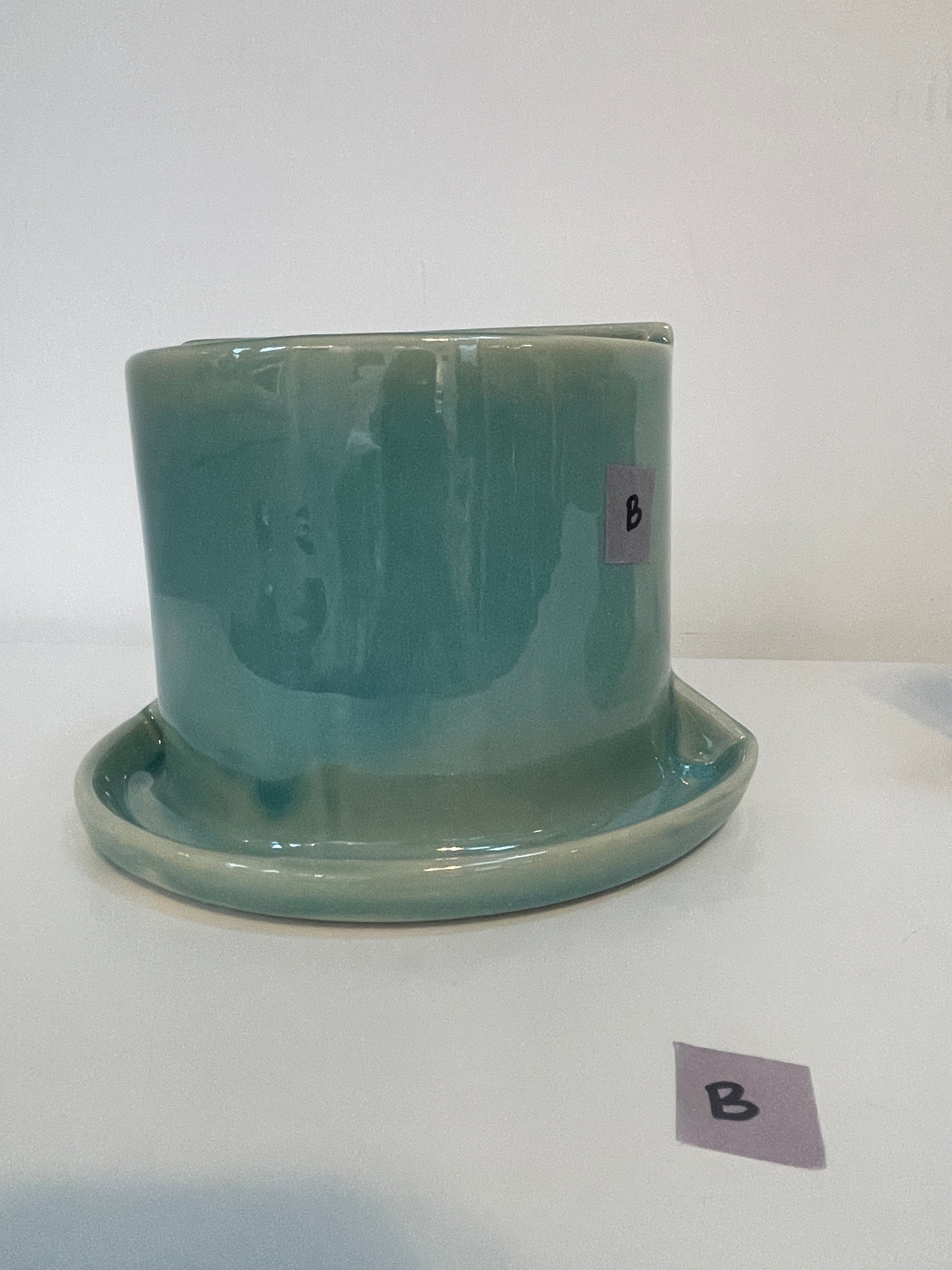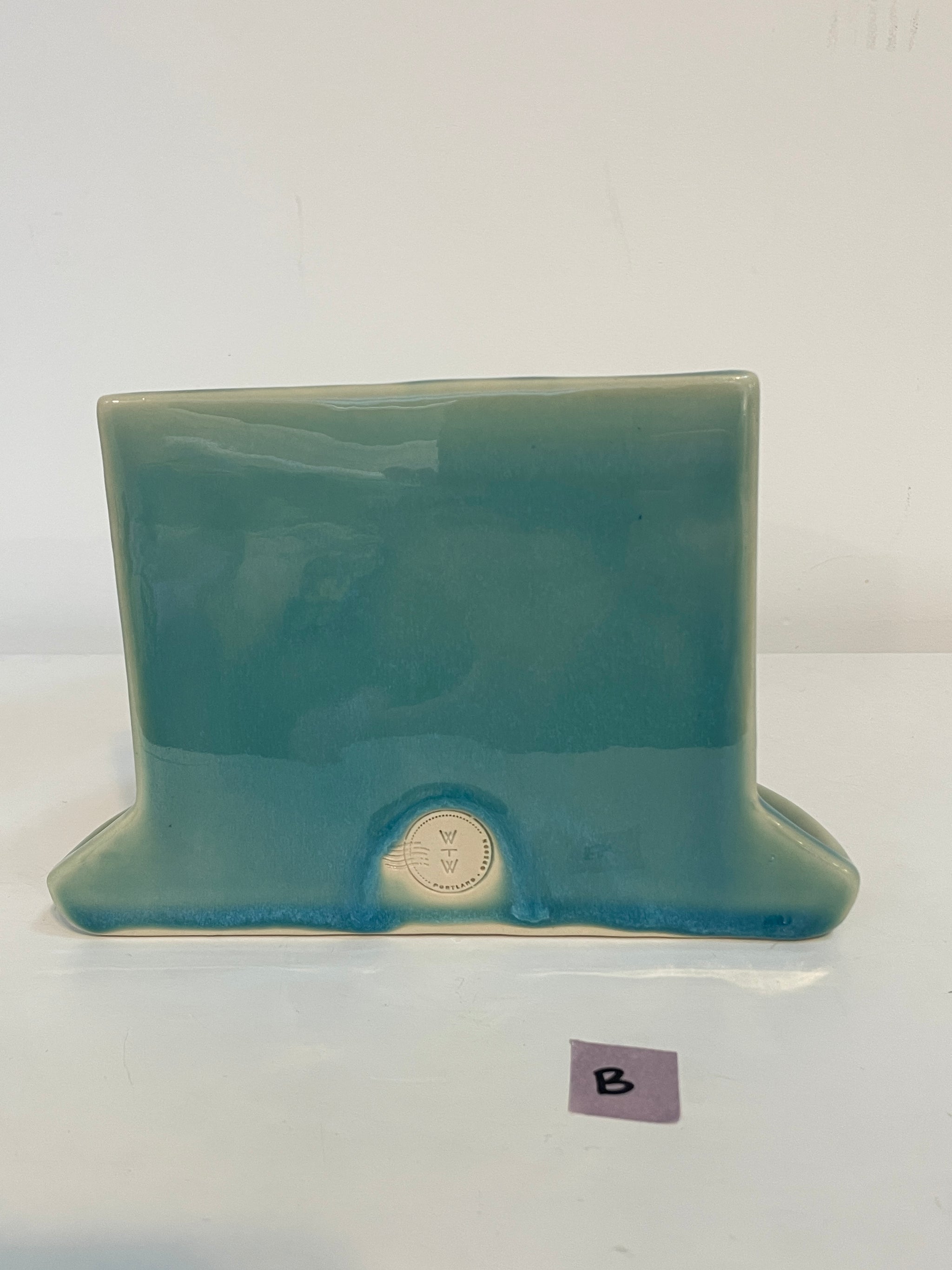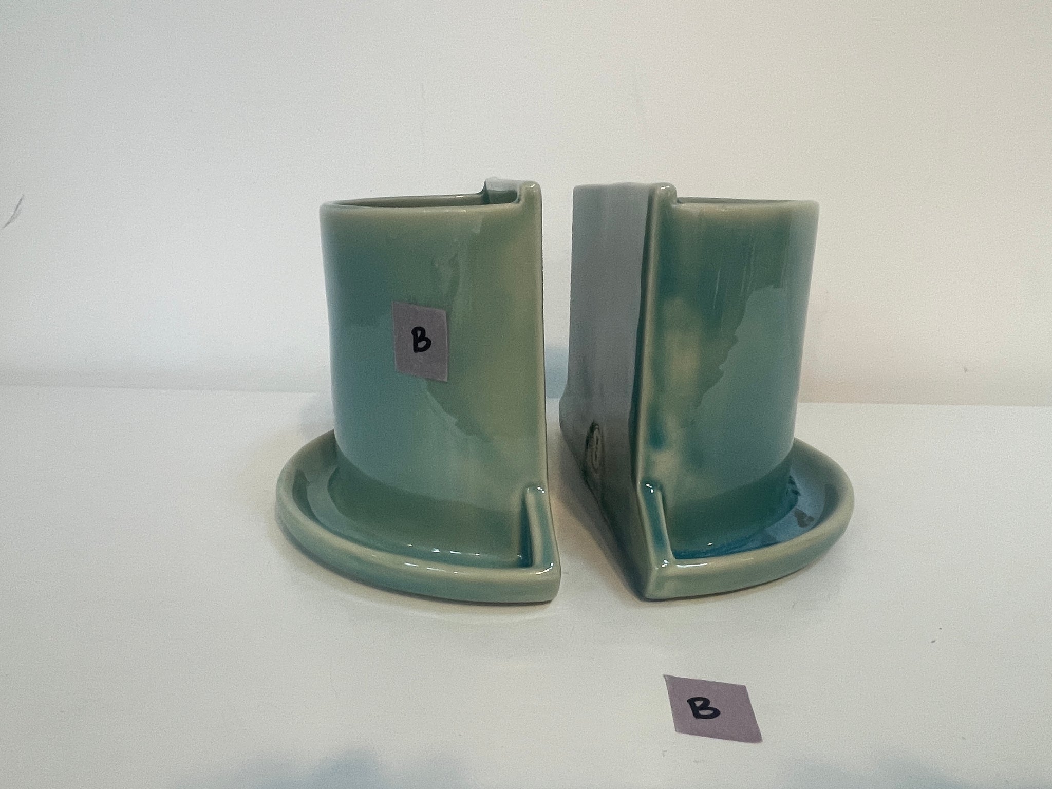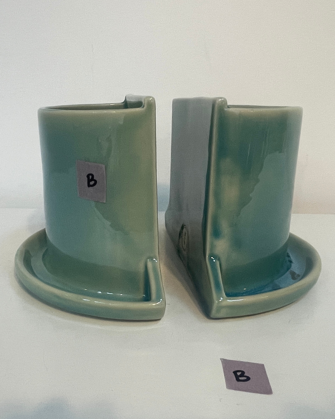All bookends are functional (tested for leaks). Most flaws are cosmetic: glaze defects, tiny cracks, warping. More flaws = bigger discount. Each one is unique, and completely handmade. In fact, these have been handled by more human hands than my wheelthrown bookends! They were slip cast by the team at Mudshark Studios. After they were handed off to my assistant Anna, she spent hours, sanding, glazing, re-glazing, sending photos and making spreadsheets, all to help me deliver a quality rendition of my designs. Ultimately the design was not a good fit for casting at the level of detail I had hoped, but this means a discounted price for you, on perfectly functional pots.