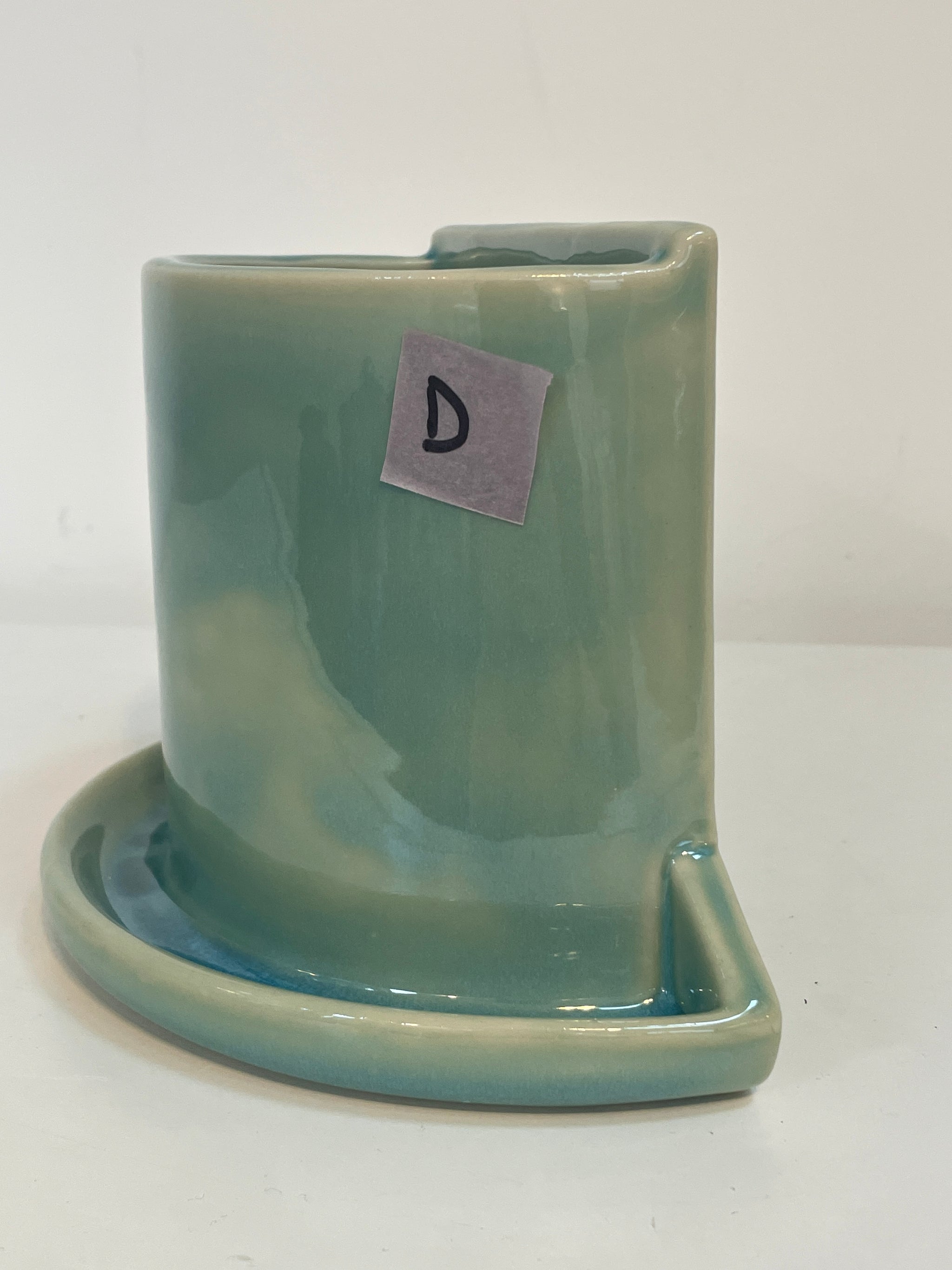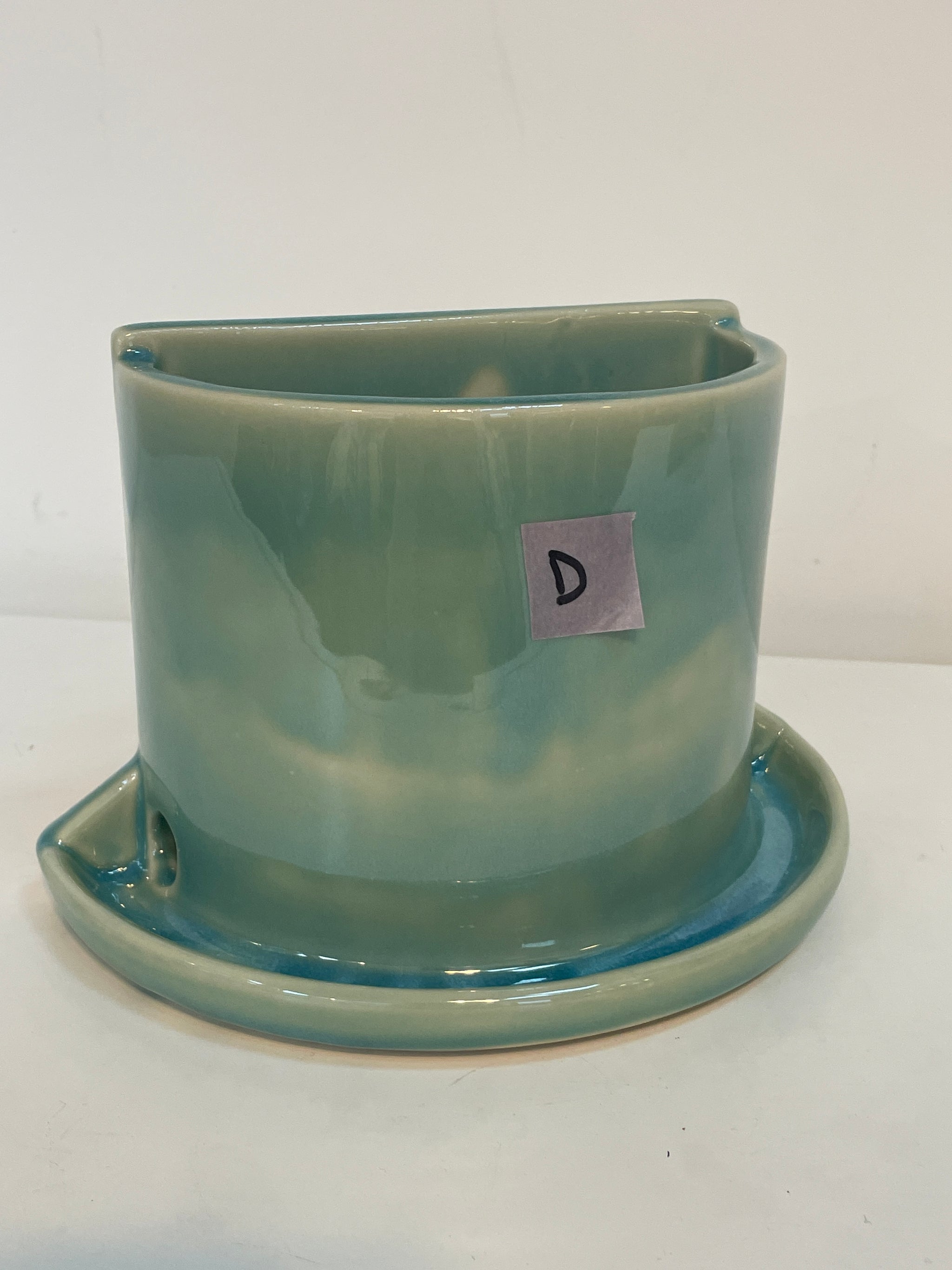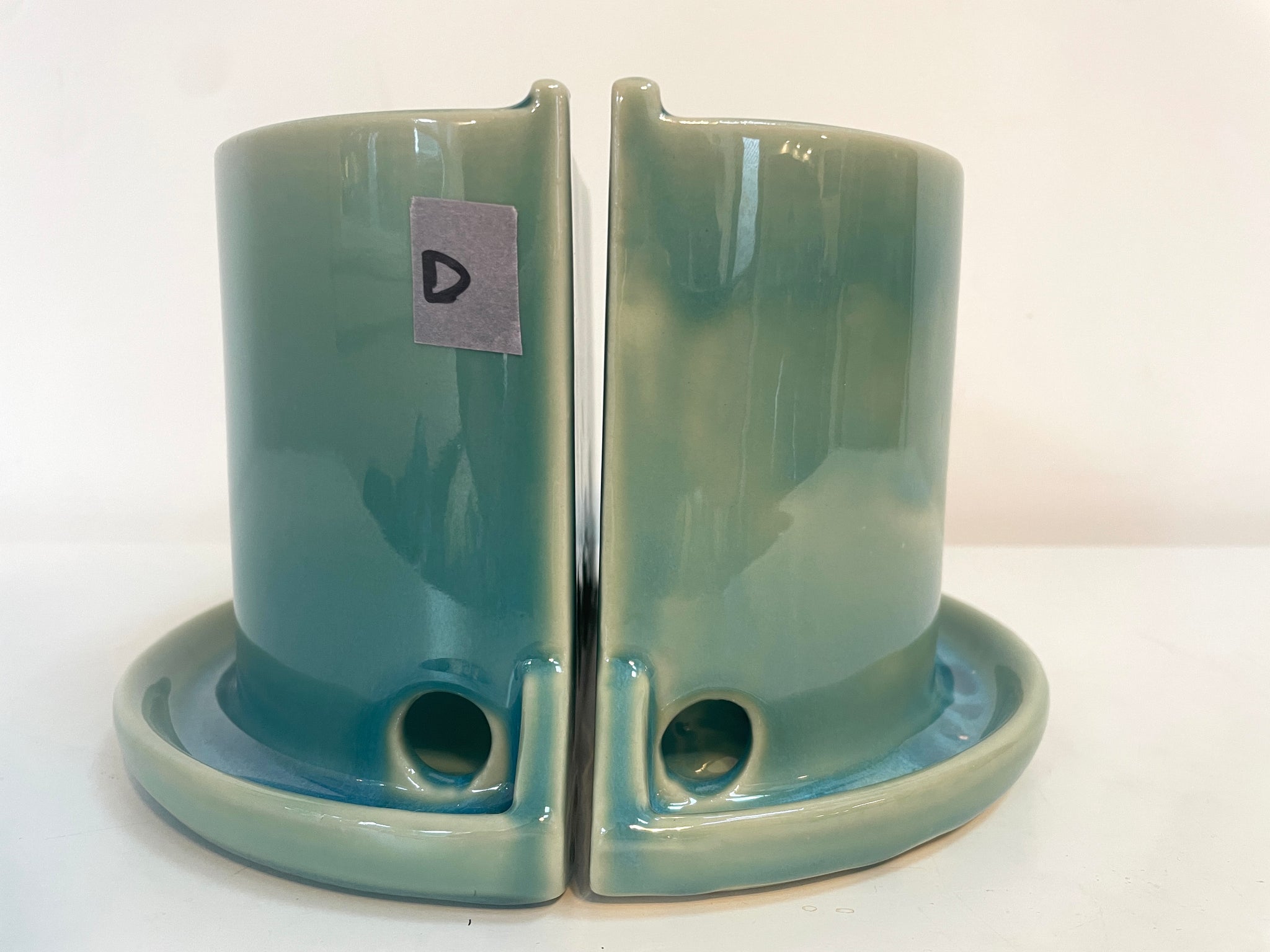 All bookends are functional (tested for leaks). Most flaws are cosmetic: glaze defects, tiny cracks, warping. More flaws = bigger discount. Each one is unique, and completely handmade. In fact, these have been handled by human hands even more than my wheelthrown bookends. They were slip cast by the team at Mudshark Studios. After they were handed off to my assistant Anna, she spent hours, sanding, glazing, re-glazing, sending photos and making spreadsheets, all to help me deliver a quality rendition of my designs. Ultimately the design was not a good fit for casting and the level of detail I had hoped, but this means a discounted price for you, with flaws that are hard to see once in use.