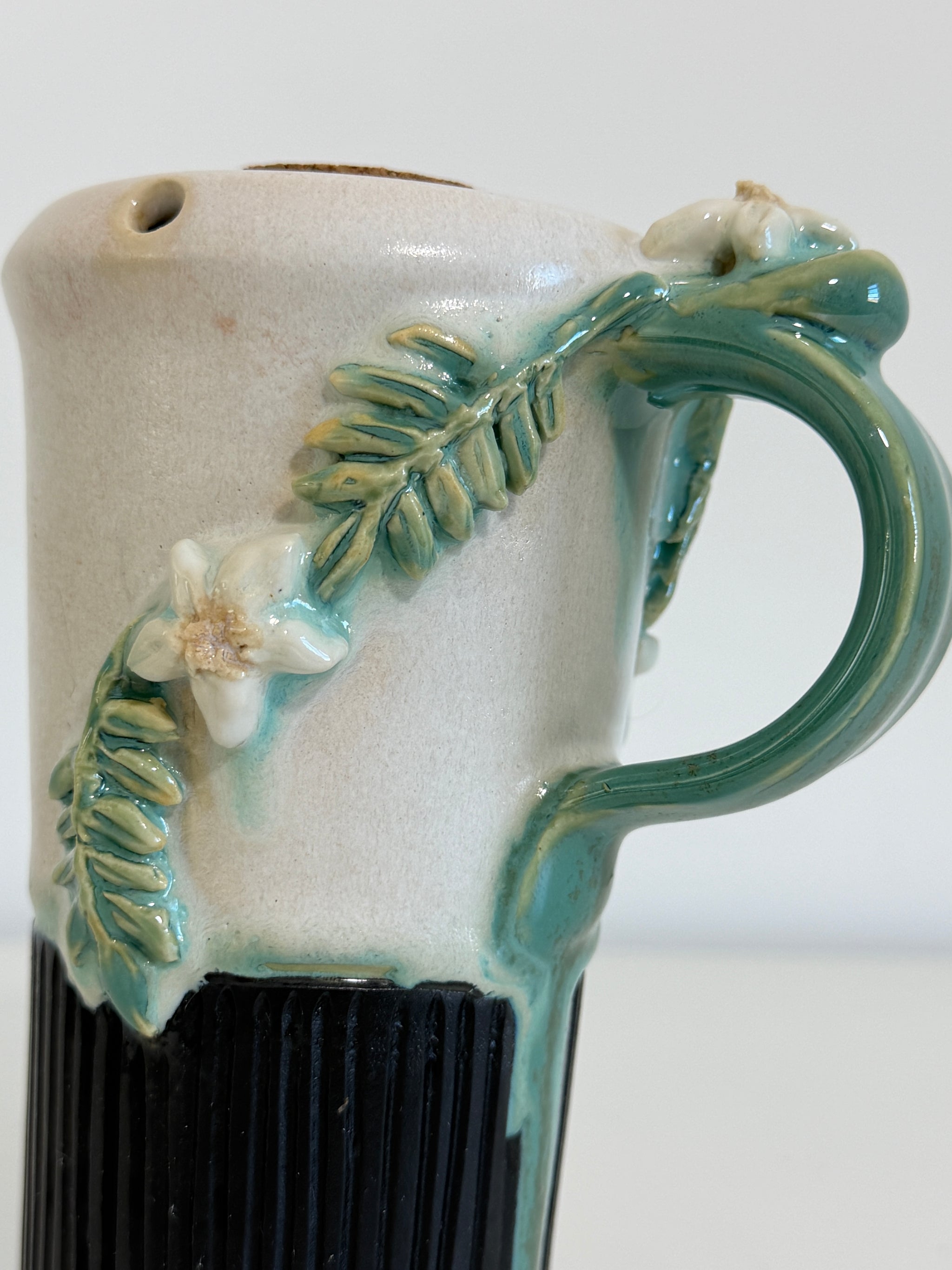 My good friend and fellow ceramic artist Wil LaBelle has been making these handy Travel Mugs for over a decade, and we have collaborated on clay projects on and off for just as long. This one-of-a-kind collab is sure to delight every time you sip from it. I carved the fluting and sculpted the leaves and flowers, before using several different glazed to get this whimsical look.